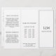 En enkel trefaldig broschyr med modern och minimalistisk utformning. På frontpanelen finns dina två första monogrambaserade logotyper och ditt företag namn omges av en gräns. På bakpanelen finns dina arbetstider och kontaktinformation. Den inre veckepanelen har två sidhuvuden och textrutor. Obs! Mapplinjerna på framsidan kan tas bort. Insidan har många-mallar för information om ditt företag på de yttre panelerna och en pris lista på panelen mitten. All text är svart över en vit bakgrund och typsnitt och färgen kan ändras till valfritt färg. Den här trivialbroschyren är underbar för en hårstilist, en skönhetssalon eller en spa, men det klassiska stil kan användas för vilket företag som helst.