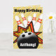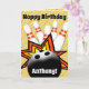 En bowlingboll och stift är roligtens födelsedagskort. Anpassade så att du kan lägga till en egen text och ändra färg i bakgrunden.