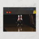 Ett vykort som innehåller ett foto på två stift som snart ska slås ner av en bowlingboll.