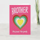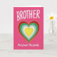This card has a hot pink background that feels bright and affectionate right away. Near the top, the word “BROTHER” appears in rounded white letters with a slight shadow that makes it stand out. In the center, there’s a large layered heart made of rings of deep red, forest green, sky blue, white, and a sunny yellow middle. A thin gold outline traces each layer, giving the heart a special, gift-like touch. Near the bottom, the message “Part friend. Part family.” is written in a flowing cursive style in white, placed neatly under the heart. The simple layout makes it easy to focus on love and appreciation for a brother who’s also a close friend 🥰. It’s a meaningful way to say you care without needing a lot of extra words ❤️. Ending it with this card is a friendly way to share Valentine’s Day sentiments.