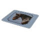 Porträtt i en mörk säl brun värmeblodsförband och idrottshäst med engelsk ridbridle i stil. Originalteckningar av Crista S. Forest.