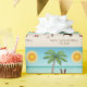 Desteis ursprungliga tecknad illustrerar en söt chokladbrun och vit jackar färg Boston Terrier-hund som står på en tropisk sommarstrand. På beige färg-sandan finns det en träd i handflatan, en rosa som är säsongsbunt med en stjärnfisk och en rödkrabba. Vatten är turkosblått med lite vinkart och sol lyser över horisonten. Det finns också ett anpassningsbara textområde.