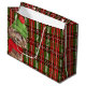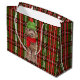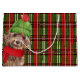 En söt brun Cockapoo sitter med en söt vinterhatt i grönt med en röd pom och en motsvarande röd scarf och är parad med rött och grönt på den här stora presentväskan för hund och djurälskare.