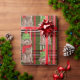 En söt brun Cockapoo sitter med en söt röd vinterscarf och en grönt vinter mot rött och grönt med mönstrad bakgrund, redo att önska vilken hund älskare eller djurälskare som helst en helgdag i lycklig.