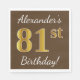 Den här enkla pappra napkin-designen innehåller ett meddelande som "Alexander's 81:a Birthday!", där "81:a" har ett faux-guld-liknande utseende, på en brun färgad. Namn kan anpassas. Den skulle kunna användas i en födelsedagsfest till någon som firar sin åttio första födelsedag. [~Z0000082]