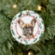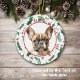 På framsidan av denna Helgdag är ornament ett vackert porträtt av en brun och vit Fransk Bulldog Hund. Porträtt ligger i en söt grönt i glättet löv och i mönster i rund ram. Baksidan av dekorationen har samma bakgrund och cirkel med anpassningsbarnas text i matchande röd och grönt. Elegant!
