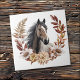 Ett vackert porträtt av en brun gräsullahäst med vit blaze placeras i mitten av en söt höstandekrans i toner av kanelbrunt, brunt och grädde. Utformningen av häst och andedräkt placeras på en vit bakgrund.