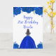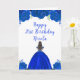 Det här födelsedagskortet innehåller blommor av blå blommigt från glitter royal och en vacker prinsessa med brunt hår och en elegant klänning. Det här är perfekt för en födelsedagsfest.