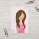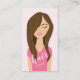 Det här individanpassade affärskortet visar Desteis illustration av en vacker kvinna med omfångsrika bruna långa hår. Kvinnans öga är stängd och hennes läppar är rosa. Kvinnan bär en rosa skjorta. Över skjortan står "hår" tillsammans med ett anpassat textområde för ett namn. Texten lutas något för att skapa och se intressant ut. På baksidan finns det ett annat anpassningsbara textområde för kontaktinformation, t.ex. adress, mobilt nummer och webbadress. Bakgrunden till färg är ljus rosa.