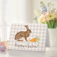 Destei's watercolor illustration of a brown hare rabbit together with some carrots. The background features a beige gingham pattern. There is also a personalizable text area that now reads: "Happy Easter!" in brown color script font.