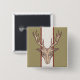 Denna knapp har en brun, brun, brun, hjort med stora antenner och en svart, etsad ansikte på en strimlad bakgrund av tan, vitt och djupt rött.