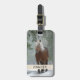 En bagagetapp med ett foto av en brun häst med en lång vit skorpa. Stå i en skog där snöflingor faller runt.
