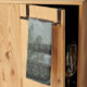 Kökshandduk med ett foto av en brun häst med lång vit skorpa. Stå i en skog där snöflingor faller runt.