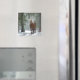 En magnet med ett foto av en brun häst med en lång vit skorpa. Stå i en skog där snöflingor faller runt.