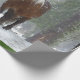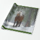 Förpackning papper med ett foto av en brun häst med en lång vit skrumpig mane. Stå i en skog där snöflingor faller runt.