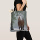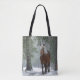 Tote-väskan med ett foto av en brun häst med en lång vit skorpa. Stå i en skog där snöflingor faller runt.