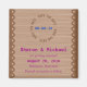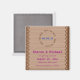 En blandning av feminin och rustik, detta unika spara datum magneter har brunt snöre mot träbakgrund och uppgifterna om bröllop är skrivna i marin och magenta.