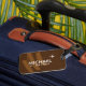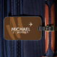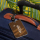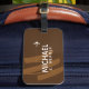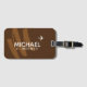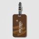 En coola och modern personlig med bagagemärke med namn och första gången med resenären på bruna bakgrunder