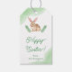 Destei's brown bunny illustration in watercolor with extra long ears is surrounded by green leaves. Green watercolor splashes on the sides add a fresh hand painted touch. The tag has two personalizable text areas, one currently reading Happy Easter and the other ideal for adding a name.