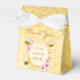 En förmånslåda för en sommar Bridal Shower. En gul bakgrund med ett bikakemönster. Med en falsk geometrisk ram i guld och falska glitterdroppar i guld. Dekorerad med rosa tropiska blommor, hibiskus och glada humlor. Med texten: Tack och Brud att bli skriven med en modern handskriven stil. Mall för brudens namn och datum för festen. Rosa, gröna och bruna bokstäver.