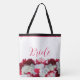 Denna axelväska visas med en blandning av röda och vita peonmönster. Texten Brud på framsidan och baksidan, men du kan ändra den till vad du föredrar.