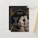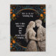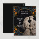 Personligt bröllopsinbjudan på svart med guld och en blomsterkant.