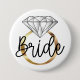 Denna knapp har orden "Brud" tillsammans med en vit diamantförlovningsring med guldband, det perfekta tillbehöret för sickenfesten för Bruden!