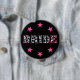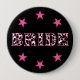 Fira brudar som ska gifta sig med dessa disco cowgirl-inspirerade möhippa-knappar. Den här knappen har ordet BRUD skrivet med svarta och vita bokstäver i ko-hud-mönster mot en svart bakgrund med rosa stjärnakcenter.