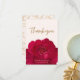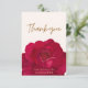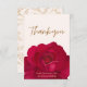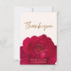 Brud i blom tema bröllopsfest tackkort har rosor och peonior i röd, rosa och vinröd färg med guld blommig och botanisk mönster. En perfekt guld och off-white färg bakgrund med röd ros arrangemang.