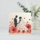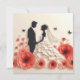 Vacker illustration av ett par i bröllopskläder med en bakgrund av röda vallmo och svarta fjärilar. Paret är i silhuett, med brudgummen i kostym och bruden i en flytande klänning med slöja. Den övergripande färgpaletten är röd, svart och vit.