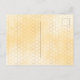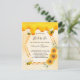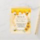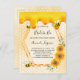 Elegant, rolig och rustik bröllopsfest-inbjudan för sommaren. En gul bakgrund med ett bikakemönster. Med en falsk geometrisk ram i guld och söt, droppande honung. Dekorerad med gula och orange solrosor och glada humlor. Med texten: "Bride to Bee" och brudens namn på framsidan, skriven med en modern handskriven typsnitt. Svarta bokstäver.