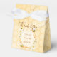 En förmånslåda för en sommar Bröllopsdusch. Gul, vit bakgrund med ett bikakemönster. Med en falsk guldgeometrisk ram. Dekorerad med ljusgul, krämfärgade tropiska blommor, hibiskus och glada humlor. Med texten: Tack och Brud till Bibi skriven med en modern handskriven stilsnacka. Mall för brudens namn och datum för duschen. Bruna bokstäver.