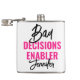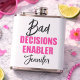 Lägg till en djärv och lekfull touch till din möhippa med denna personliga flaska "Bad Decisions Enabler". Perfekt för brudtärnan eller den ultimata medbrottslingen, har denna snygga och stilrena flaska iögonfallande typografi med en rolig blandning av skrivstil och feta bokstäver. Den anpassade namninformationen gör den till en minnesvärd souvenir för firandet och en bra present till bröllopsgästerna. Kompakt och lätt att bära, är den idealisk för nätter ute, festfoton och oförglömliga stunder med brudgänget.
