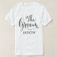 En djärv borste kalligrafi "Brudgummen" design med ett anpassningsbart förnamn gör denna tee till en stående för bröllopsfirande. Det överdimensionerade skriptet på vitt ger en modern, polerad look för möhippor, repetitionens middag och själva stora dagen. Redigera namnet för att skapa en monogrampresent till brudgummen.