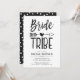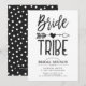 En inbjudan till bröllopsbrunch anpassad för din betrodda brudtrio. Den har ett klassiskt svartvitt tema med orden bride tribe skrivna med en handskriven typsnitt. Mellan båda orden finns en tribalpil som genomborrar ett hjärta.