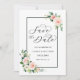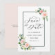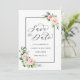 Denna bröllopsinbjudan för att spara datumet har målade akvarellblommor i brudrosa, vit och grön bladverk med en rektangulär ram. För mer avancerad anpassning av denna design, vänligen klicka på "Anpassa"-knappen. Matchande artiklar finns också tillgängliga.