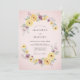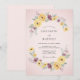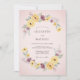 Denna design har en mjuk brudslöja bakgrund prydd med livliga gula rosor och djupa lila blommor. Diskret grönska och löviga kvistar skapar en livlig vårkänsla. Paletten blandar varma solskenstonaliteter med romantiska pasteller för en glad atmosfär. Perfekt för en säsongsbetonad utomhusceremoni.