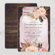 Vacker bohemisk bröllopsinbjudan med en murarvas dekorerad med brudslöja rosa blommor, fjädrar och grönska. Anpassa enkelt denna blommiga bröllopsinbjudan med dina bröllopsdetaljer för att komplettera din rustika landsbygd eller bohemiska bröllopsfest.