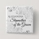 Identifiera nyckelpersonerna på din brudkväll, bröllop eller repetitionsmiddag med våra eleganta silverfärgade falska folieknappar. Designad för att samordna med vårt eleganta silverfoliebröllopspaket, har denna knapp en silverfärgad falsk folie-detalj på vit bakgrund med svart text som lyder Stegmor till brudgummen och en plats för att ange hennes namn. Perfekt som en souvenir eller gåva till medlemmarna i bröllopet.