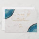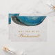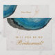 Detta eleganta "Vill du vara min brudtjänsteflicka" förfrågningskort har en marmorerad bakgrund och en stor blå agatgeod i den övre halvan på framsidan och två blå geoder i hörnen på baksidan. Ordet "brudtjänsteflicka" är skrivet med en elegant kalligrafisk stil. Meddelandet på baksidan är skrivet med samma stil. All text har en gyllene färg.