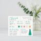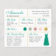 En brudtärningsinformationskort för en smaragdgrön och guld bröllopsfest, inklusive information om bröllopsdatum och plats, bröllopsfärger, brölloppspartiet, brudtärningsklänningen och ett förslag till meddelande till brudtärningen. Brudtärningens namn och titlarna är skrivna med en grön elegant skrivstil. I det nedre högra hörnet finns en smaragdgrön klänning. I mitten finns bröllopsfärgerna i cirklar. Färgerna, inklusive färgen på brudklänningen, kan ändras, med undantag för den gyllene cirkeln, som är falsk guldfolie. Standardfärgerna är grönt, rosa och guld. Baksidan är smaragdgrön, likt brudtärningsklänningens färg.