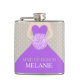 Elegant grafisk brudtärna klänning i lila som håller en bukett av lila syren stiliserade rosor bröllops hip flask. Läser Brudtärna Melanie. Anpassa med ditt eget namn och titel Ett bra presentidé för bröllops shower, möhippa eller bröllopsrepetition.