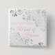 Identifiera nyckelpersonerna på din bröllopsfest, bröllop eller repetition middag med våra eleganta, rosa och grå knappar. Designad för att samordna med vår Rosa & Grå Eleganta Bröllopssvit, har denna knapp en silverfärgad falsk folieaccent på en vit bakgrund med rosa text som lyder Brudtärna och en plats för att skriva in hennes namn. Perfekt som en souvenir eller gåva till medlemmarna i bröllopet.