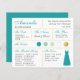 En brudtärnings informationskort för en teal- och guldbröllop, inklusive information om bröllopsdatum och plats, bröllopets färger, brölloppspartiet, brudtärningsklänningen och ett meddelande om förfrågan om att bli brudtärning. Brudtärningens namn och titlarna är skrivna med en elegant tealblå skrivstil. I det nedre högra hörnet finns en tealklänning. I mitten finns bröllopets färger i cirklar. Färgerna, inklusive färgen på brudklänningen, kan ändras, med undantag för den gyllene cirkeln, som är falsk guld folie. Standardfärgerna är teal, två nyanser av mint, vit och guld. Baksidan är tealfärgad, likt brudtärningsklänningens färg.