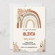 De här vackra inbjudningarna till babyduschen har trendiget boho stil och handskrivet skript för trendig. En terracotta och en söt målad regnbåge av neutralt dekoreras med blommor av orange och persikofärg på en vit bakgrund.