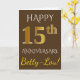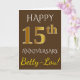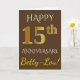 Denna enkla, personliga gratulationskortdesign för bröllopsdag har budskapet "GRATTIS PÅ 15-ÅRS BRÖLLOPSDAGEN", där "15" har ett falskt guldliknande utseende. Framsidan har också ett anpassat namn och en brun bakgrund. Insidan har ett anpassningsbart gratulationsmeddelande för bröllopsdag. Det kan ges till en make eller en maka för att fira parets femtonårsdag.