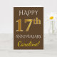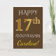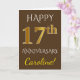 Denna enkla, personliga gratulationskortdesign för bröllopsjubileum har meddelandet "HAPPY 17th ANNIVERSARY", där "17th" har ett falskt guldliknande utseende. Framsidan har också ett personligt namn och en brun bakgrund. Insidan har ett personligt gratulationsmeddelande för bröllopsjubileum. Det kan ges till en make eller en maka för att fira parets sjuttonde bröllopsjubileum.