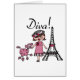 DivaT-tröja, bodysuits, rånar, hänger lös, kort, klistermärkear, nyckelringar, kudder, tar tid på väggen, och mycket mer med en gullig divadesign som presenterar en brun haired flicka i en hatt och en rosaklänning med henne den rosa pudeln nära det Eiffel torn!