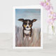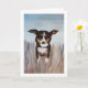 En vänlig hund som leker i det höga gräset är ett bra sätt att säga hej. Överför enkelt denna akvarellmålning till andra kort och presenter. Blå, beige, brun och karamellfärgade nyanser är vackra som tackkort, födelsedagskort eller bara för din personliga brevpapper.