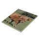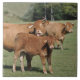 En kvadrera belägger med tegel med ett foto av en guld- brun limousin ko med horns som tvättar henne kalven, stund som kalven slickar hans egna näsa.